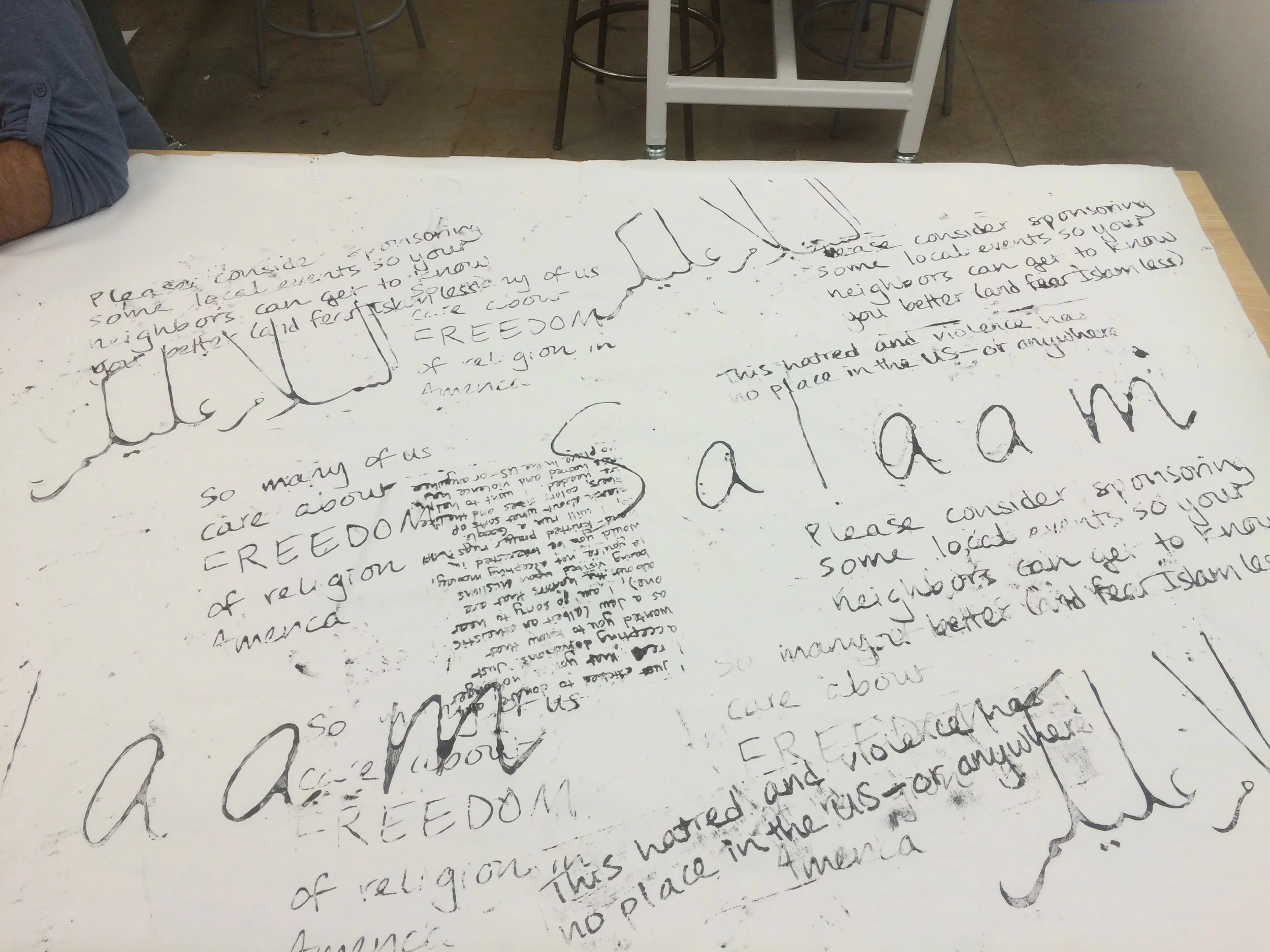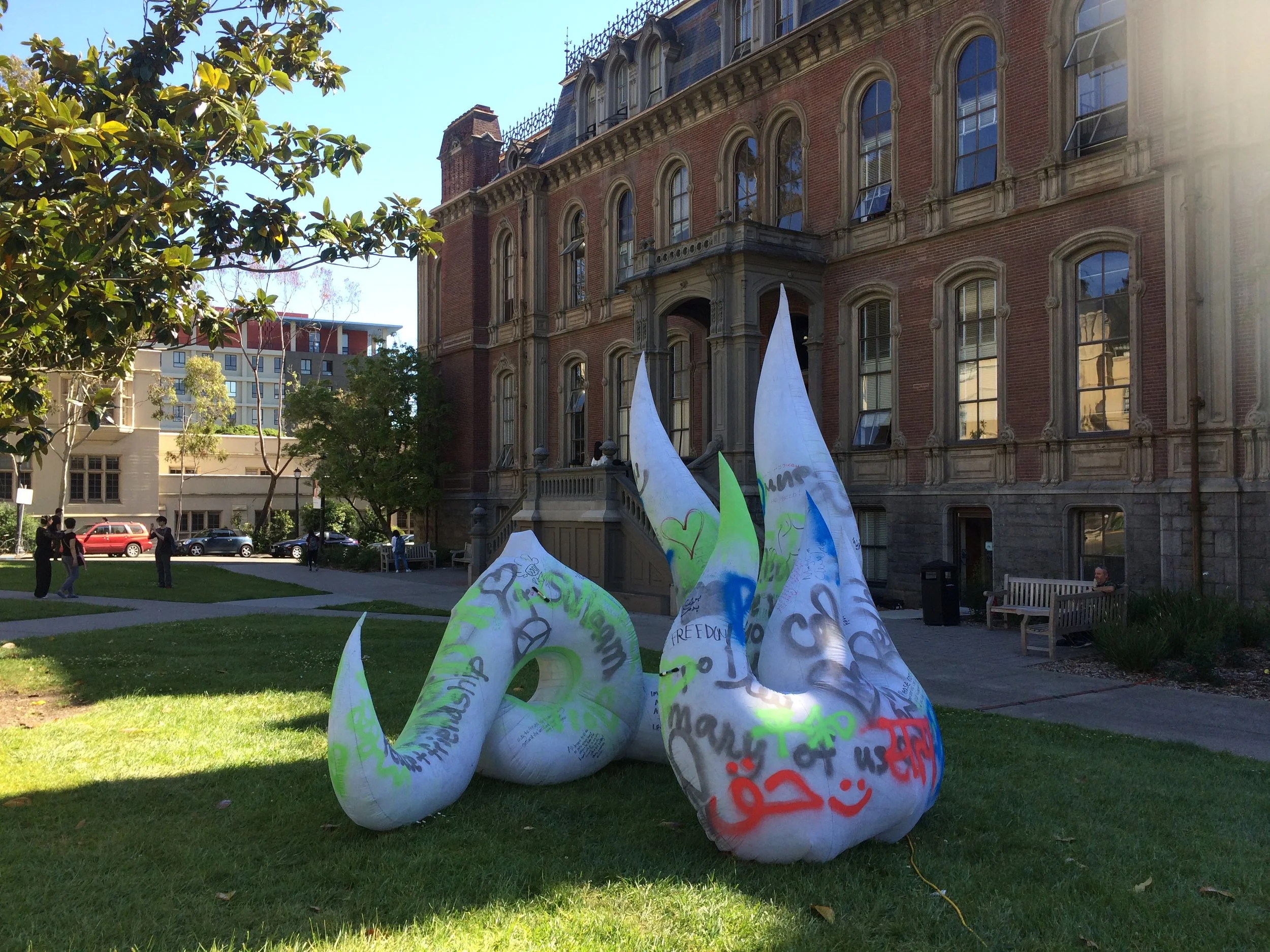 This sculpture/inflatable is inspired by the form and meaning of the Arabic word "salaam" meaning peace or a greeting to wish peace upon others. In January 2017, the Victoria Islamic Center in Texas was burned down. Since then, there have been several more mosque arsons. The Victoria Islamic Center started a GoFundMe campaign in order to raise money to rebuild their mosque, and it was incredibly successful by reaching over double its goal. The sculpture was shown at the 8th Annual Islamophobia Conference as well as a few locations on the Berkeley campus.